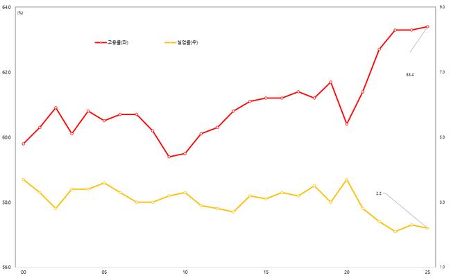 10월 15세 이상 고용률은 63.4%로 전년 대비 0.1%p 상승했고 15~64세 고용률은 70.1%로 0.3%p 올랐다. 경제활동참가율은 64.8%(+0.1%p), 실업률은 2.2%(-0.1%p)였다. 15세 이상·15~64세 고용률과 경활률 모두 10월 기준 역대 1위를 기록했다.