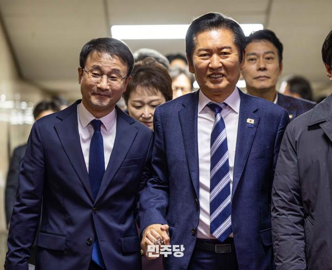 정청래 당대표가 2026.01.11.(일) 국회 본청 246호에서 원내대표 선출을 위한 의원총회에 참석하여 신임 원내대표로 선출된 한병도 원내대표와 걸어가고 있다.